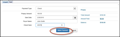 select the Payment type> enter the amount> Sale Date will be the date the owner is making the payment> enter the Payor Name> enter the Check Number (if applicable)> finally click Make Payment.