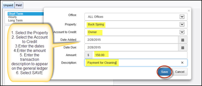 select the property> select the Account to Credit: Owner> the Date Added & Date Due will be the date the receivable is being entered> enter the amount the owner is paying> enter a description> finally click Save.