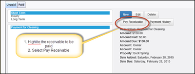 Owner payments are posted to the owner’s account in Accounting through Accounts Receivable. This is a two-step process that requires you to first create and then pay receivable. These steps are described below.