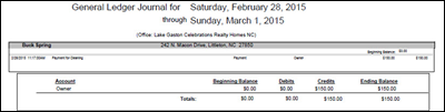 3. Once the payment is posted to the receivable the money should show in the owner account. This can be verified by pulling the General Ledger Journal report for the property’s owner account during the time frame the payment was posted. Also this payment will appear under Deposits to be added to the daily deposit.
