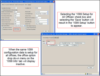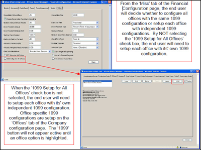 If one 1099 is to be generated for all owners regardless of the owner having different properties within different offices, the end user will select the '1099 Setup for All Offices' check box, select the '1099 Setup' button, and setup the 1099 configuration. Selecting the '1099 Setup for All Offices' check box and then selecting the 'Save' button will result in a '1099 Setup' button to appear on the 'Misc' tab of the Financial Configuration page. Selecting the '1099 Setup' button and applying the 1099 configuration values will result in all 1099s generated from the VRM application to use the same 1099 configuration data. When the 1099 configuration data is setup for all offices, the office option drop down menu on the '1099 Info' tab will appear inactive.