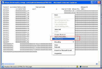 To reconfigure the file as a text file place the mouse cursor within the body of the file and right click. This action will cause a drop down menu to appear. Select the 'View Source' option from the drop down menu.