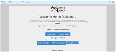 From the Welcome Home Dashboard you can access any of the features Welcome Home offers two different ways.  You can either select from the list of options listed in blue text: ‘Office Configuration’, ‘Property Configuration’, ‘Event Messages’, or ‘Manual Messages’, or you can choose one of the tabs above the phrase ‘Welcome Home Dashboard’: ‘Guest Extranet’ or ‘Messaging’.  (‘Home’ is the Welcome Home Dashboard.)  If you decide to use the tabs, once you open the ‘Guest Extranet’ tab, tabs are displayed for ‘Office Configuration’ and ‘Property Configuration’, and clicking on the ‘Messaging’ tab reveals the ‘Events Messages’ tab and the ‘Manual Message’ tab.