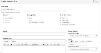 You can choose from four different events to tie your message to: ‘Check In Date’, ‘Check Out Date’, ‘Any Payment’, and ‘Reservation Cancelled’.