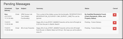 After you selected to send your message at a later time and clicked the ‘Send Message’ button, you might change your mind and decide you do not want to send that message. If that is the case, go back to the Welcome Home Dashboard. You will notice a new tab has been added called ‘Pending Messages’. Clicking on this tab will display the messages you have waiting to be sent. If you decide to cancel a Manual Message you set up to send at a later date, simply click the red box with the ‘X’ in it to the right of the message line. Messages selected to be sent ‘Now’ will not be in the list. They cannot be stopped.