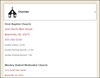 When a guest clicks the plus sign on the right side of the ‘Churches’ heading, the detailed information you entered in the ‘Categories’ screen will display.