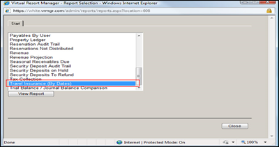(Select the Accounting button from the VRM main menu > Select the Reports button from the Accounting menu > Select the Travel Insurance By Dates report option > Select the View Report button)