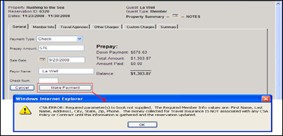 ‘CSA ERROR: Required parameter(s) to book not supplied. The Required Member Info values are: First Name, Last Name, Address1, City, State, Zip, Phone. The money collected for Travel Insurance IS NOT associated with any CSA Policy or Contract until this information is gathered and the reservation updated.’