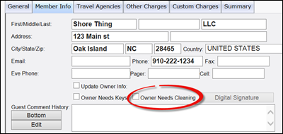 b. Select Member Info tab> if Owner needs cleaning check the “Owner Needs Cleaning” box in order for the reservation to appear under Schedule Housekeeping