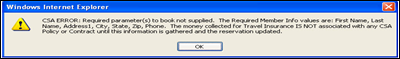 ‘CSA ERROR: Required parameter(s) to book not supplied. The Required Member Info values are: First Name, Last Name, Address1, City, State, Zip, Phone. The money collected for Travel Insurance IS NOT associated with any CSA Policy or Contract until this information is gathered and the reservation updated.’