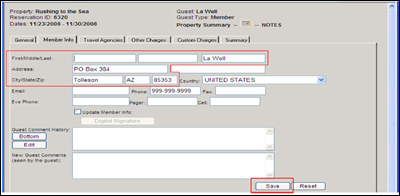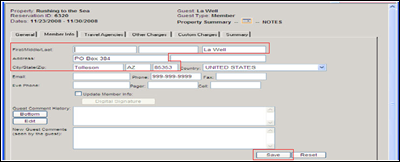 2. From the ‘Member Info’ tab of the reservation, verify the following member values are populated: First Name, Last Name, Address1, City, State, Zip, Phone.