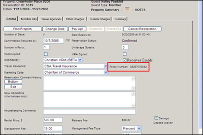 2. When payments are applied to reservations within the VRM application, it is the responsibility of each reservationist to verify the CSA XML request is sent accurately. Reservations will display the CSA policy number on the ‘General’ tab when the CSA XML request is sent accurately.