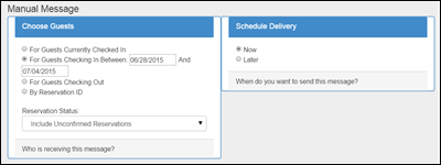 If you had chosen to send your message to either ‘Guests Checking In’ or ‘Guest Checking Out’, you would have noticed a new drop-down box would have appeared with the heading ‘Reservation Status’. The options included in the drop-down box are ‘Include Pending’ and ‘Exclude Pending’. This box determines whether or not the message you are creating will be sent to the reservations in your system that have an ‘Unconfirmed’ status when the message is sent. You can either choose to send it to Reservations with an ‘Unconfirmed’ status by selecting ‘Include Unconfirmed Reservations’, or you can choose not to send it to Reservations with an ‘Unconfirmed’ status by selecting ‘Exclude Unconfirmed Reservations’.
