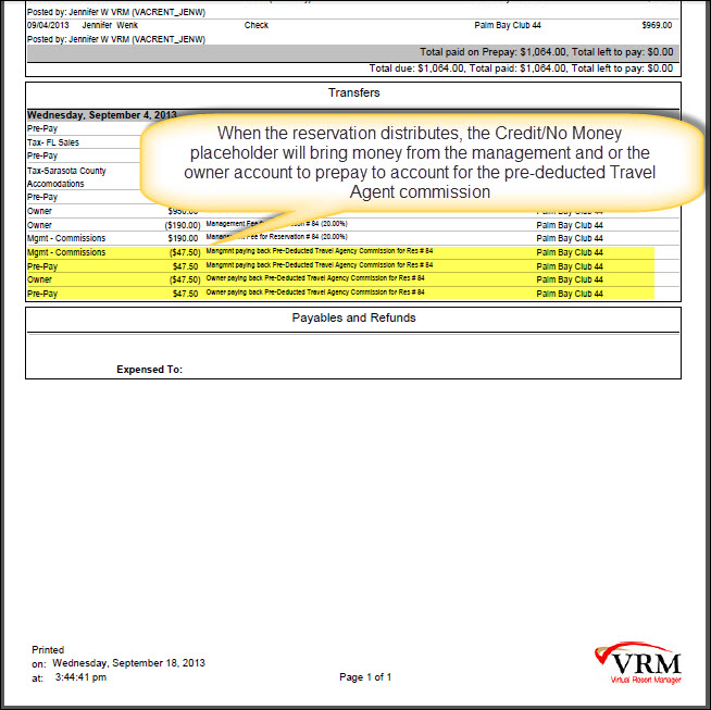 3. When a reservation distributes, an automatic Credit/No money payment set up when a pre-deduct TA is added prior to initiating a reservation will be replaced by a debit from the owner/management accounts to replace the credit/no money transaction.